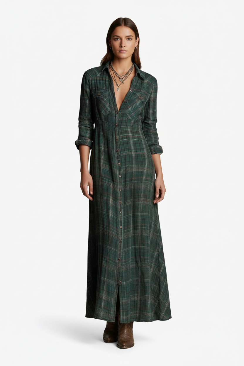 Denne tidløse maxi-kjole i ternet stof forener rustik charme og feminin elegance. Med sit bløde fald og flatterende silhuet er den perfekt til kvinder, der elsker komfort uden at gå på kompromis med stilen.