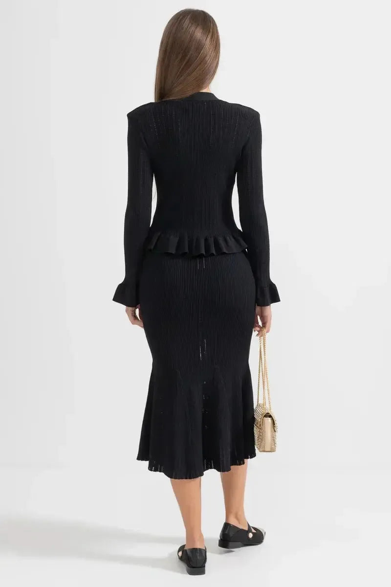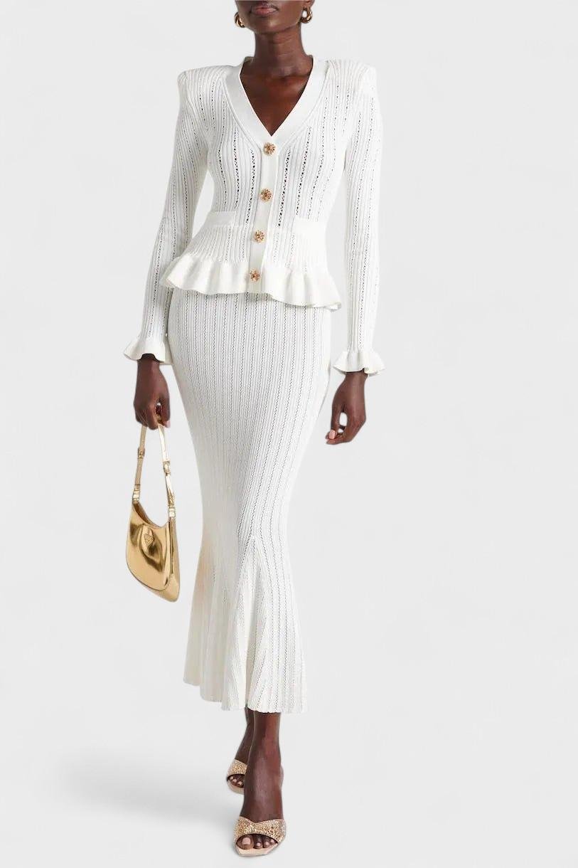 Prudence | Sæt udstråler tidløs elegance og mærkets stolte arv gennem hvert snit. Sættet består af en figursyet V-hals cardigan med sarte ruffles ved ærmerne og vintage-inspirerede knapper sammen med en højtsiddende A-line midi-nederdel, alt sammen i førsteklasses garn og udført med minutiøs syning. Den bløde, åndbare konstruktion giver komfort hele dagen, mens de velovervejede detaljer og den elegante snit sikrer en sofistikeret silhuet, der nemt går fra afslappet til formel. Med begrænset tilgængelighed tilbyder Prudence | Sæt en ægte samlerappel og en tidløs investering i garderoben, der holder år efter år. Højt liv og A-line snit giver en tidløs, flatterende silhuet, der holder år efter år.