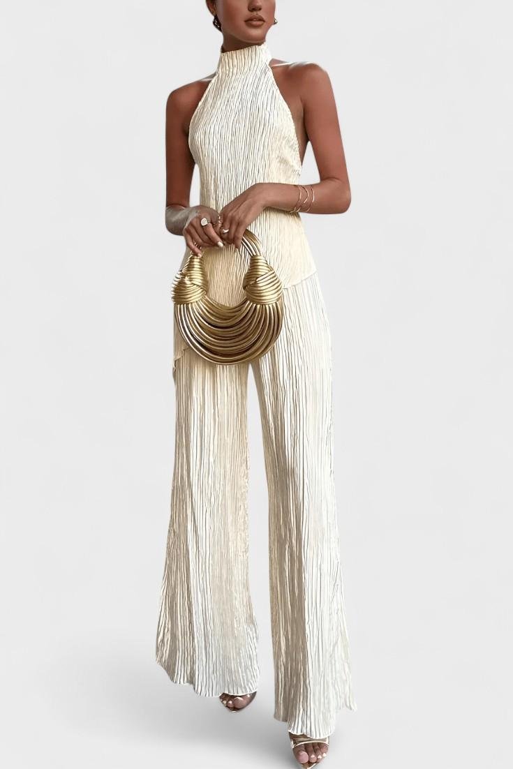 Freja | Minimalistisk sæt repræsenterer et møde mellem tidsløs elegance og håndværk i ypperste kvalitet. Den asymmetriske halterneck-top med åben ryg og høj krave fremhæver en slank silhuet, mens de lange, brede bukser bevæger sig med dig og afslører en sofistikeret drapering. Stoffet er plisseret med en diskret glans og en blød fornemmelse, der følger kroppens kurver. Freja hviler på en arv af klassisk kvalitet og omhyggelig detaljeudførelse, hvilket gør sættet til en investering i garderoben. Sortimentet er begrænset, hvilket giver eksklusivitet og tidløs samlerværdi.